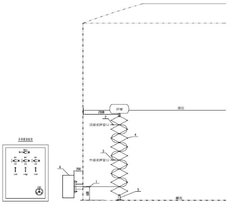 1、管束托架 2、管束支座 3、金屬軟管 4、采樣箱 5、采樣箱接管 6、下部樣采樣管 7、支撐管 8、中部樣采樣管 9、上部樣采樣管 10、浮球
