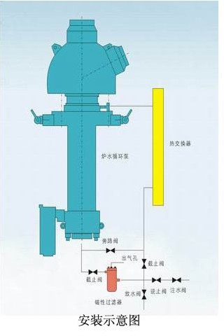 過濾器進(jìn)出水口應(yīng)與爐水泵電機(jī)的冷卻循環(huán)水的方向一致。