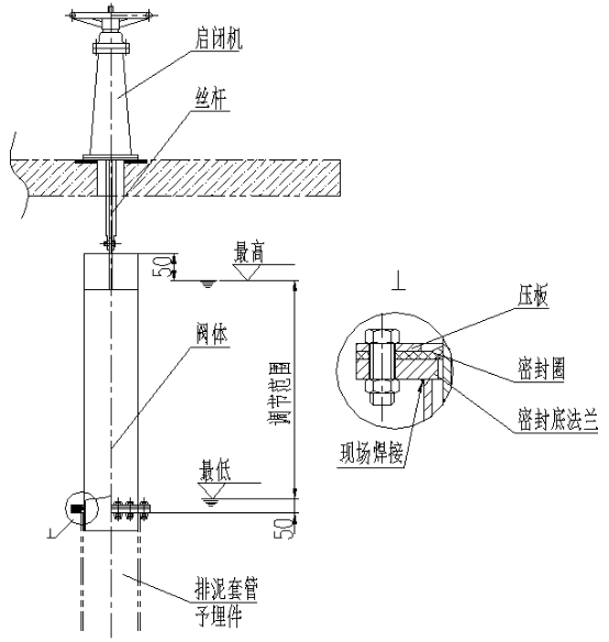 套筒排泥閥主要由閥體、密封底法蘭、密封圈、壓板、絲桿、啟閉機(jī)等構(gòu)成如圖所示: