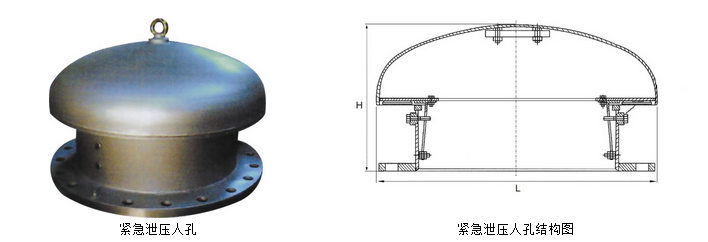 緊急泄壓人孔是提供緊急泄壓排氣功能的儲罐安全保護(hù)裝置。當(dāng)儲罐受外力或內(nèi)在影響壓力急劇上升到額定壓力時緊急泄放人孔釋放出過出過剩壓力。當(dāng)壓力回到設(shè)定的壓力,緊急泄壓人孔封面重新閉合從而保持罐內(nèi)的常壓狀態(tài)。