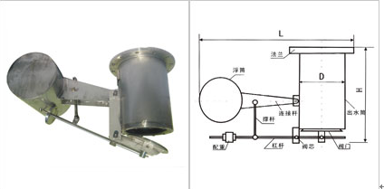 本產(chǎn)品根據(jù)油水密度不同的特點(diǎn),依靠浮筒在油水介質(zhì)中的浮力差實(shí)現(xiàn)截油排水。當(dāng)沉砂井里有水,且達(dá)到一定高度時(shí)浮筒上浮,通過杠桿只要較小的力就能將減壓閥打開,并使排水閥芯中的通氣孔打開,水從排水閥流入出水筒內(nèi),實(shí)現(xiàn)減壓,浮筒繼續(xù)上浮,將排水閥打開,水從排水閥進(jìn)入出水筒內(nèi),由出水筒排水。沉砂井內(nèi)的介質(zhì)是油時(shí),浮筒下沉,通過杠桿將減壓閥芯的通氣孔閉合,進(jìn)而將排水閥關(guān)閉,阻止油品外泄。當(dāng)天氣干干旱沉砂井內(nèi)無水時(shí),排水閥自動(dòng)保持關(guān)閉狀態(tài)。當(dāng)儲(chǔ)油罐區(qū)排放系統(tǒng)介質(zhì)是油水混合狀態(tài)時(shí),油水在沉砂井內(nèi)分層,下部水由排水閥排出,油被截留在沉砂井內(nèi),只要收集沉砂井里的油即可。以此,實(shí)現(xiàn)了油灌區(qū)截油排水完全自動(dòng)化。