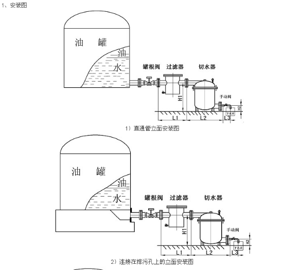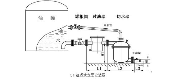 1、 本產(chǎn)品要求安裝在平穩(wěn)、堅(jiān)固的地基上。進(jìn)水口應(yīng)平于或略低于油罐排水口。安裝方式分兩種:①不帶虹吸管的油罐安裝(參見圖一、圖二)。②帶虹吸管的油罐安裝(參見圖三)